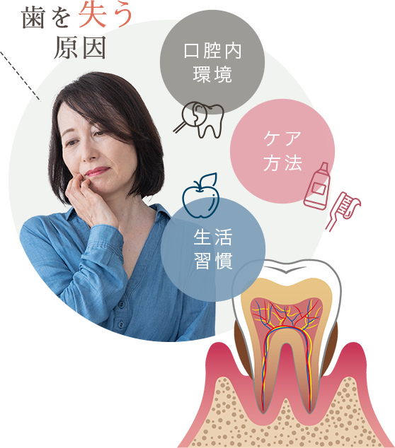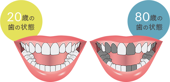 つまり、どんな方でも80歳で半分の歯を失う人生を送らなければならないわけではなく、しっかり原因を把握し対策をしていけば80歳でほとんどの歯が残っている状態にすることも可能ということです。